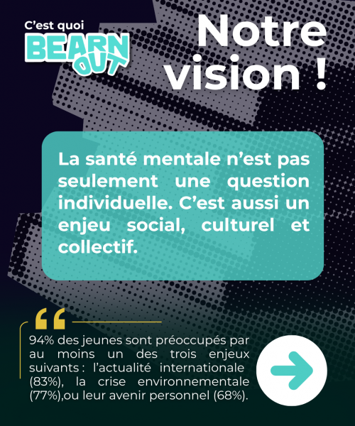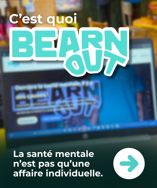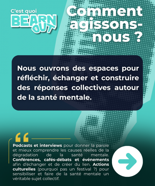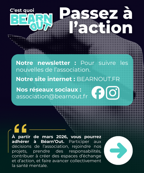 Bearn’Out existe pour changer ça. Nous voulons créer des espaces où l’on peut parler collectivement du burn-out et de la santé mentale, comprendre les causes profondes, échanger, s’organiser et agir ensemble. Podcasts, interviews, tables rondes, événements culturels… et pourquoi pas un festival ?, toutes nos actions visent à dépasser l’individuel pour construire une résistance collective, offrir du soutien et transformer la parole en action.